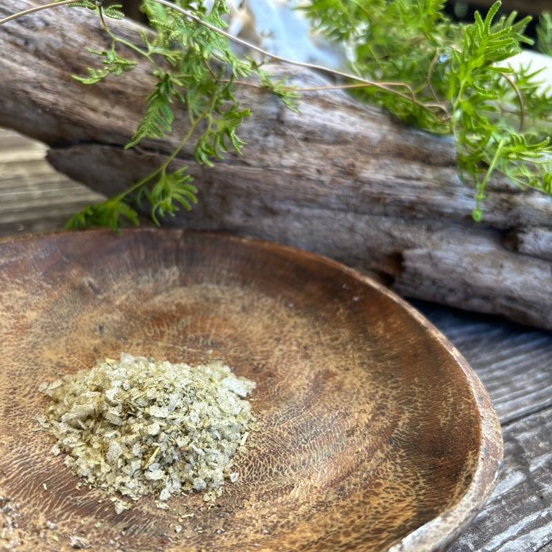 奄美大島の美しい海から丁寧に時間をかけて作られた釜焚き塩をベースに、無農薬で育てたハーブや野草、野菜、果物をブレンドした、力強く香り高いハーブソルトです。
